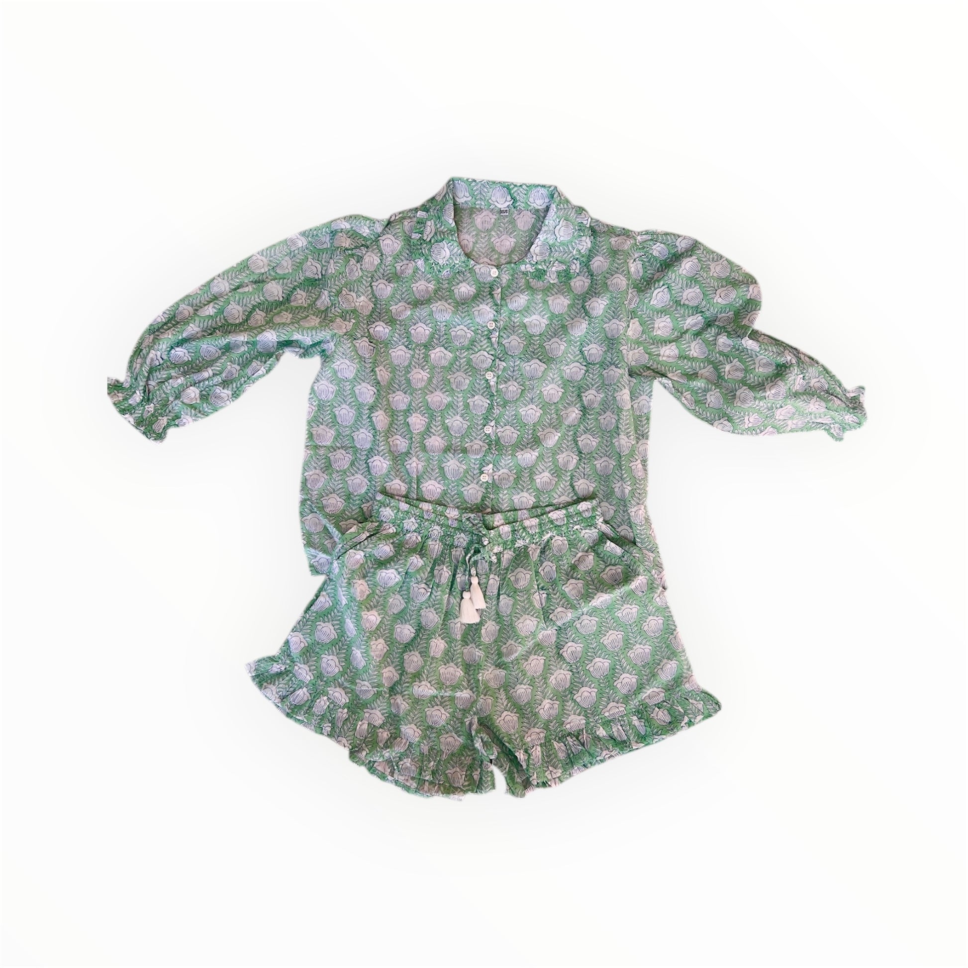 Sweet pajama set with long sleeved top and ruffled edge shorts. Comes folded in a matching hand block printed cotton gift bag.
