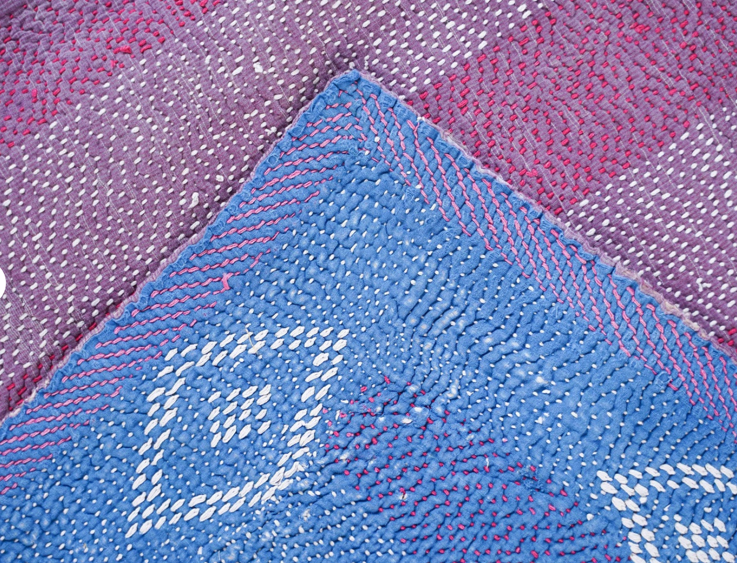 Beautifully handmade using repurposed vintage cotton saris, this one-of-a-kind kantha quilted throw is the perfect addition to your living room, your bedroom, or as a beach blanket. This unique quilt contains character and charm with patchwork that tells its own story. It also makes for a wonderful housewarming or wedding gift. Finished edges.